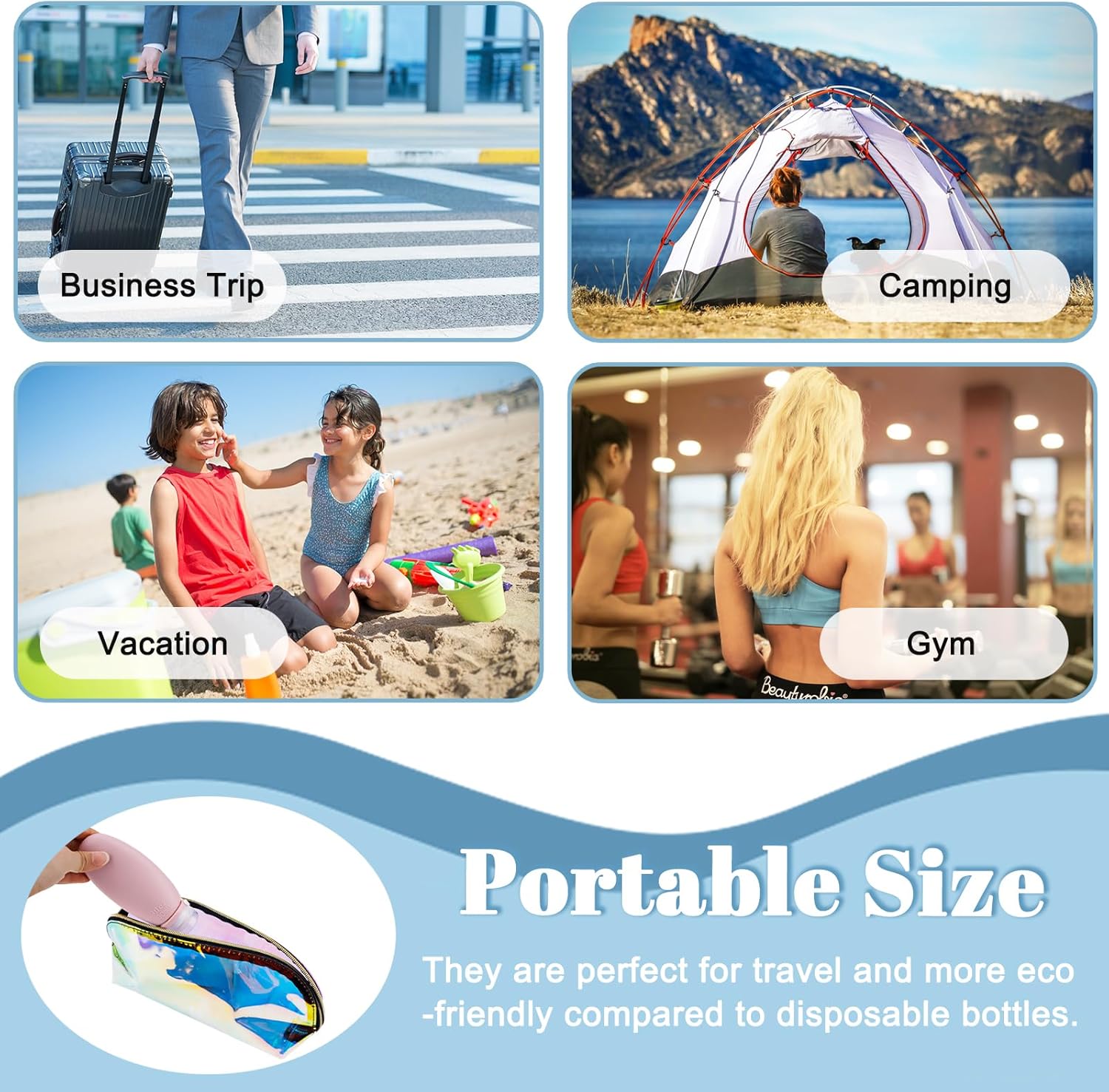 【Portable Size】Portable travel size silicone bottles are perfect for travel, you can fill them with shampoo, conditioner, body wash, skin lotion, sunscreen or other essential lotions and put them in your gym bag or handbag, or even in your suitcase.