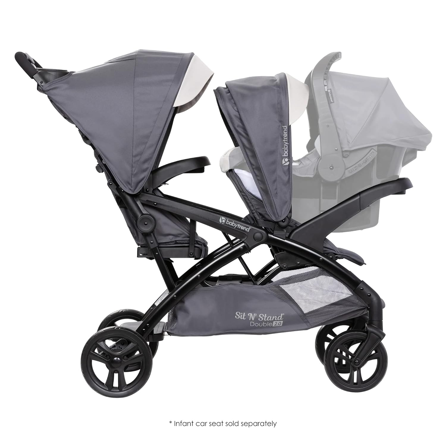 Double Stroller: Children can sit in the front and rear seats of the tandem stroller or stand on the rear platform; Compatible with BabyTrend car seats and supports up to 50 pounds