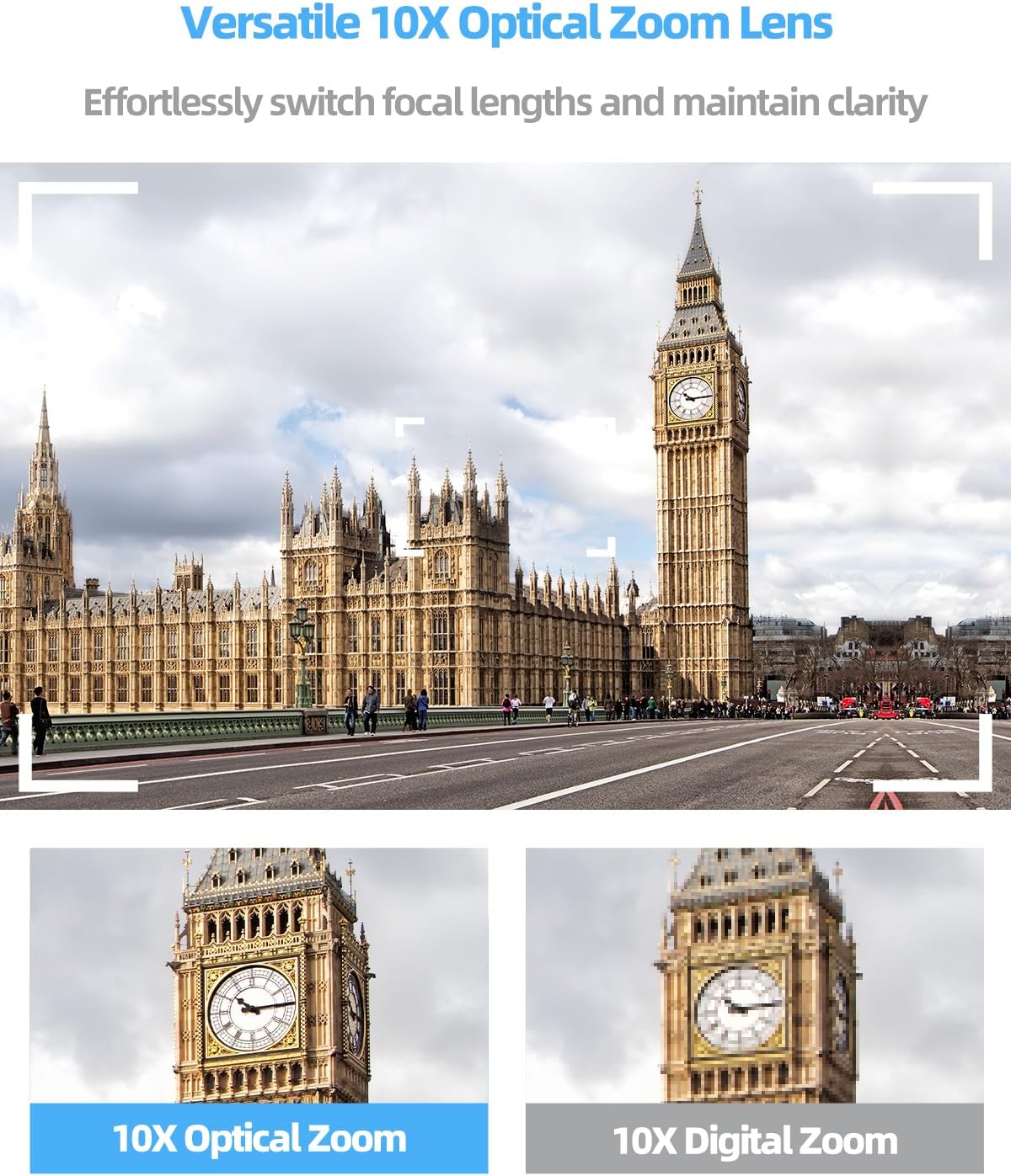 【Versatile 10X Optical Zoom Lens】: Designed with 10X optical lens, this camcorder allows you to effortlessly switch focal lengths and maintain clarity when capturing distant subjects. Half-press the PHOTO button for autofocus during shooting, and capture close-up photos when the macro function is enabled.