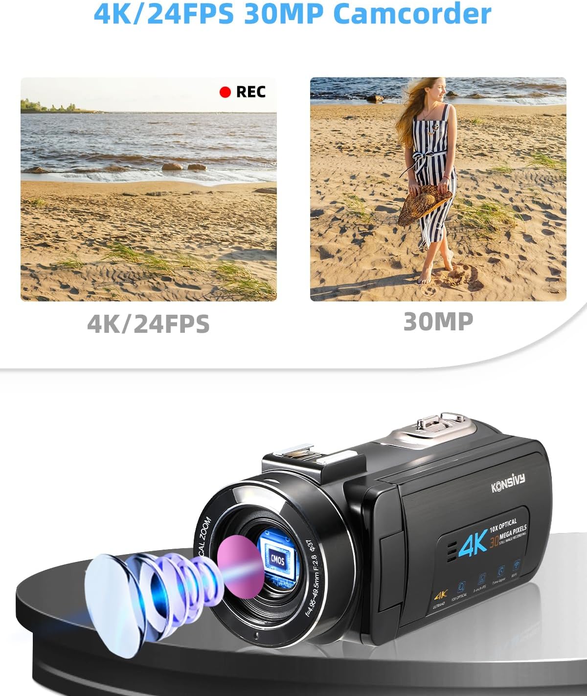 KONSIVY 4K 10X Optical Zoom Video Camera Camcorder with Auto Focus,3.0″ IPS Touch Screen Digital Camera,30MP Vlogging Camera,WiFi, 2.4G Remote Control, 2 Batteries and 32GB SD Card