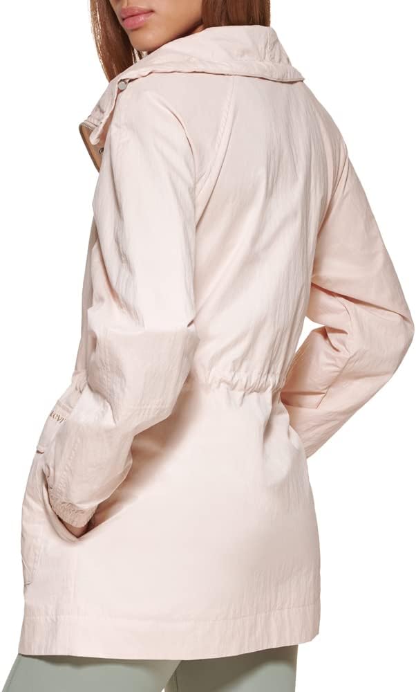 Functional cinch waist utility jacket with an adjustable bungee cord waist and collar, two lower snap pockets with side entry, elasticized cuffs, and a center front zipper closure