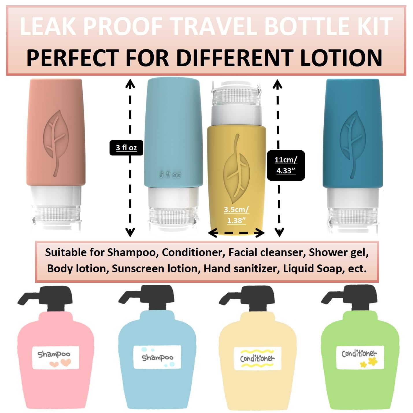 Travel Bottles for Toiletries, 4 Pack 3OZ TSA Approved Travel Size Containers, Leak Proof Refillable Travel Accessories for Shampoo Conditioner, BPA Free Travel Bottles with Toiletry Bag