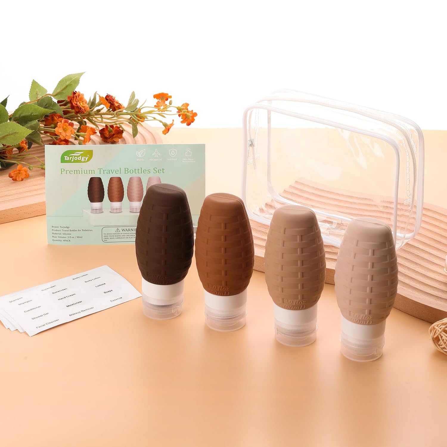 [TSA Approved Travel Toiletries Pack]: Set of 4 small empty bottles, a clear toiletry bag and 2 sheets of stickers with 12 different Labels. The size of a single bottle is 3 oz, a large capacity still for airline carry on. The labels include the most things people will probably fill with. The plastic bag is made of thicker pvc material, sturdy metal zipper and black reinforce stich, durable, cute and makes organization easier.